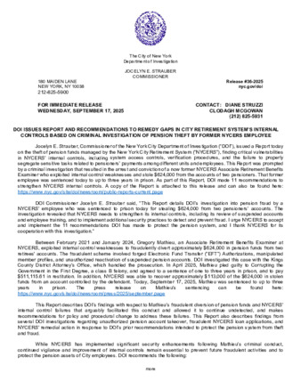 User Rosemary Rumph has attached 36NYCERS.Release.Rpt.09.17.2025.pdf to DOI ISSUES REPORT AND RECOMMENDATIONS TO REMEDY GAPS IN CITY RETIREMENT SYSTEM’S INTERNAL CONTROLS BASED ON CRIMINAL INVESTIGATION OF PENSION THEFT |
