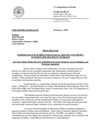 | User Rosemary Rumph has attached Zeno_Guilty_Plea_PR.pdf to FORMER EXECUTIVE DIRECTOR OF LEGAL SERVICES NON-PROFIT IN QUEENS PLEADS GUILTY TO FRAUD |
