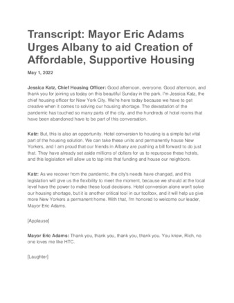 | User Ciara Collins has attached Mayor_s_Press_Office_May_1_2022.pdf to Transcript: Mayor Eric Adams Urges Albany to aid Creation of Affordable, Supportive Housing |