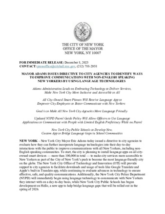 | User Nessa Raskin has attached MAYOR_ADAMS_ISSUES_DIRECTIVE_TO_CITY_AGENCIES_TO_IDENTIFY_WAYS.pdf to Mayor Adams Issues Directive to City Agencies to Identify Ways to Improve Communications With Non-English Speaking New Yorkers |
