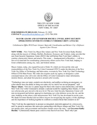 | User Ciara Collins has attached Mayor_s_Press_Office_Feb_22_2022.pdf to MAYOR ADAMS AND GOVERNOR HOCHUL UNVEIL JOINT SECURITY OPERATIONS CENTER TO COMBAT CYBERSECURITY ATTACKS |