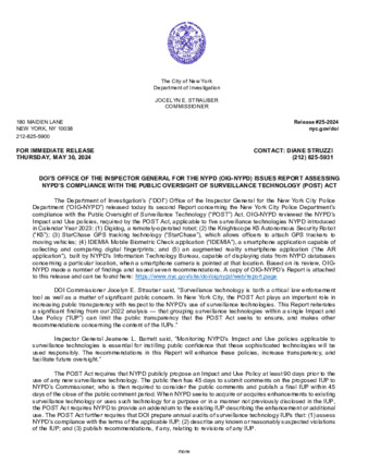| User Rosemary Rumph has attached 25PostActRelease_Rpt_05_30_2024.pdf to DOI’S OFFICE OF THE INSPECTOR GENERAL FOR THE NYPD (OIG-NYPD) ISSUES REPORT ASSESSING NYPD’S COMPLIANCE WITH THE PUBLIC OVERSIGHT OF SURVEILLANCE TECH |