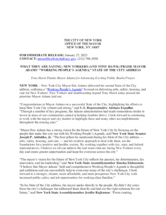 | User Ciara Collins has attached Mayor_s_Press_Office_Jan_27g_2023.pdf to WHAT THEY ARE SAYING: NEW YORKERS (AND TONY HAWK) PRAISE MAYOR ADAMS’ “WORKING PEOPLE’S AGENDA,” STATE OF THE CITY ADDRESS |