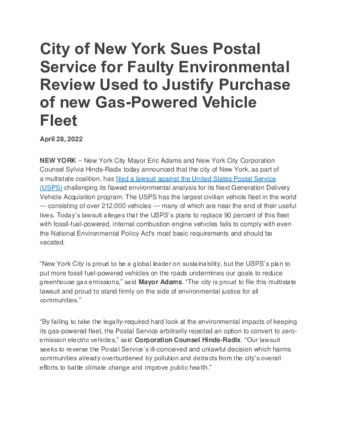 | User Ciara Collins has attached Mayor_s_Press_Office_April_28c_2022.pdf to City of New York Sues Postal Service for Faulty Environmental Review Used to Justify Purchase of new Gas-Powered Vehicle Fleet |