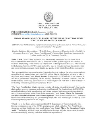 | User Ciara Collins has attached Mayor_s_Press_Office_Sept_15c_2022.pdf to MAYOR ADAMS ANNOUNCES $110 MILLION FEDERAL GRANT FOR HUNTS POINT TERMINAL PRODUCE MARKET |