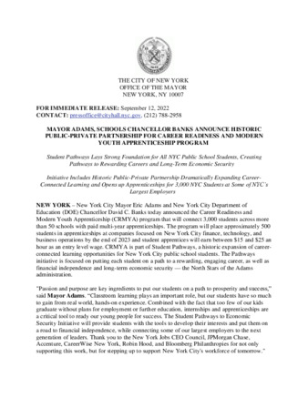 | User Ciara Collins has attached Mayor_s_Press_Office_Sept_12_2022.pdf to MAYOR ADAMS, SCHOOLS CHANCELLOR BANKS ANNOUNCE HISTORIC PUBLIC-PRIVATE PARTNERSHIP FOR CAREER READINESS AND MODERN YOUTH APPRENTICESHIP PROGRAM  |