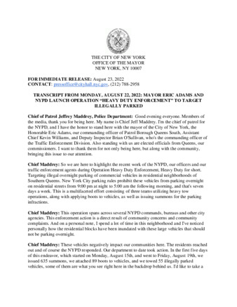 | User Ciara Collins has attached Mayor_s_Press_Office_Aug_24e_2022.pdf to TRANSCRIPT FROM MONDAY, AUGUST 22, 2022: MAYOR ERIC ADAMS AND NYPD LAUNCH OPERATION “HEAVY DUTY ENFORCEMENT” TO TARGET ILLEGALLY PARKED |
