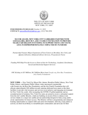 User Ciara Collins has attached Mayor_s_Press_Office_Oct_12f_2022.pdf to MAYOR ADAMS, NEW YORK CITY’S LIBRARIES PARTNER WITH GOOGLE.ORG, BEST BUY, JOLY FAMILY FOUNDATION TO PROVIDE FUNDING TO SUPPORT TEENS AND YOUNG ADULTS April 12th, 2024 15:58