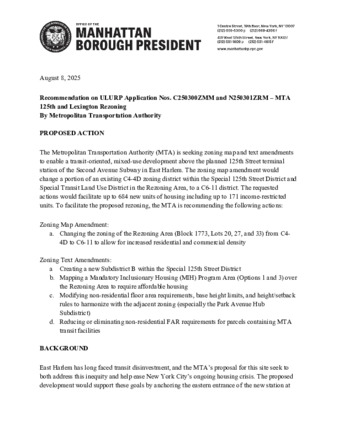 User Peter Torre has attached MTA-125-Street-Rezoning-MBP-Levine-Recommendation-1-1__1_.pdf to Recommendation on ULURP Application Nos. C250300ZMM and N250301ZRM – MTA 125th and Lexington Rezoning |