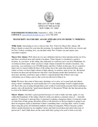 | User Ciara Collins has attached Mayor_s_Press_Office_Sept_1_2022.pdf to TRANSCRIPT: MAYOR ERIC ADAMS APPEARS LIVE ON MSNBC’S “MORNING JOE” |