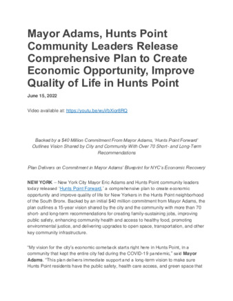 | User Ciara Collins has attached Mayor_s_Press_Office_June_15c_2022.pdf to Mayor Adams, Hunts Point Community Leaders Release Comprehensive Plan to Create Economic Opportunity, Improve Quality of Life in Hunts Point |