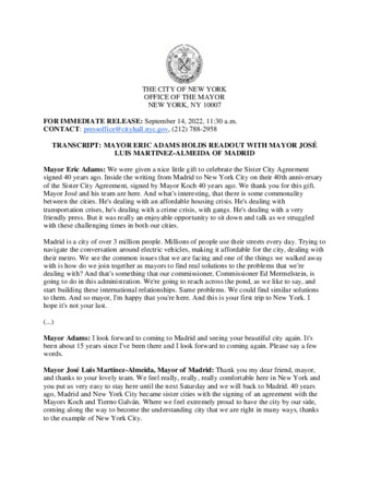 | User Ciara Collins has attached Mayor_s_Press_Office_Sept_14b_2022.pdf to TRANSCRIPT: MAYOR ERIC ADAMS HOLDS READOUT WITH MAYOR JOSÉ LUIS MARTINEZ-ALMEIDA OF MADRID |