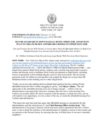 | User Ciara Collins has attached Mayor_s_Press_Office_Feb_14d_2022.pdf to MAYOR ADAMS SHUTS DOWN ILLEGAL HOTEL OPERATOR, ANNOUNCES PLAN TO CREATE 80 NEW AFFORDABLE HOMES ON UPPER WEST SIDE |