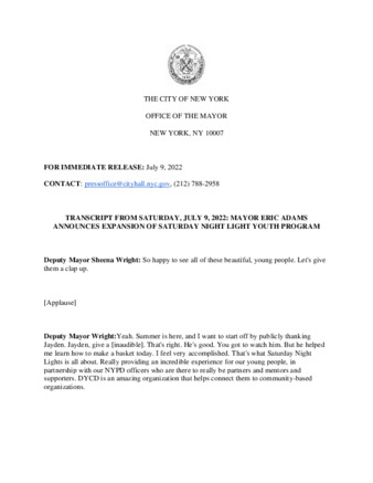 | User Ciara Collins has attached Mayor_s_Press_Office_July_10b_2022.pdf to TRANSCRIPT FROM SATURDAY, JULY 9, 2022: MAYOR ERIC ADAMS ANNOUNCES EXPANSION OF SATURDAY NIGHT LIGHT YOUTH PROGRAM |