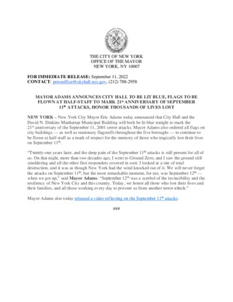 | User Ciara Collins has attached Mayor_s_Press_Office_Sept_11_2022.pdf to MAYOR ADAMS ANNOUNCES CITY HALL TO BE LIT BLUE, FLAGS TO BE FLOWN AT HALF-STAFF TO MARK 21st ANNIVERSARY OF SEPTEMBER 11th ATTACKS, HONOR LOST LIVES |