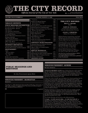 The City Record newspaper publishes notices which includes but is not limited to: public hearings and meetings, public auctions and sales, solicitations and awards and official rules proposed and adopted by city agencies.