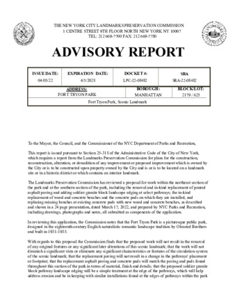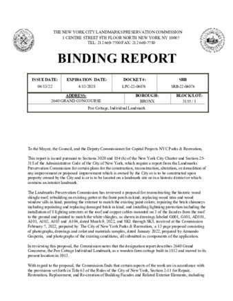 As required by New York City Administrative Code, Title 25, Section 318, report containing the April 2022 Staff Level Reports of the Landmarks Preservation Commission