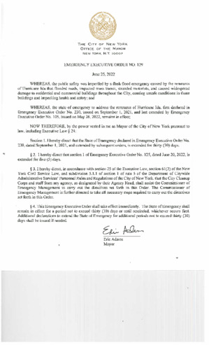 Emergency Executive Order No. 129, extends Emergency Executive Order No. 125, dated June 20, 2022, for five (5) days, if this is related to Hurricane Ida.