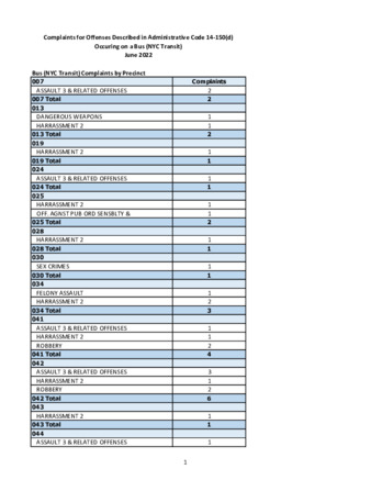 Pursuant to Admin Code Sect. 14-150(d), this monthly report contains information on complaints and arrests for violent felony offenses, assault, sex offenses, disorderly conduct, harassment, aggravated harassment, and offenses against public sensibilities that occurred in transit
