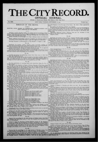 The City Record newspaper publishes notices which includes but is not limited to: public hearings and meetings, public auctions and sales, solicitations and awards and official rules proposed and adopted by city agencies. This is the City Record Newspaper for September 16, 1902.