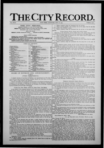 The City Record newspaper publishes notices which includes but is not limited to: public hearings and meetings, public auctions and sales, solicitations and awards and official rules proposed and adopted by city agencies. This is the City Record Newspaper for May 16, 1903.