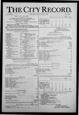 The City Record newspaper publishes notices which includes but is not limited to: public hearings and meetings, public auctions and sales, solicitations and awards and official rules proposed and adopted by city agencies. This is the City Record Newspaper for August 07, 1905.