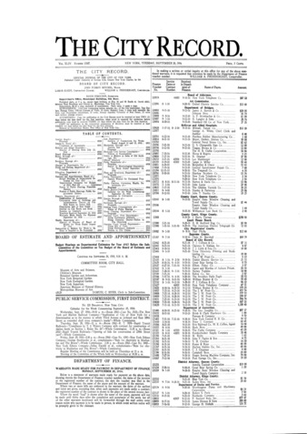 The City Record newspaper publishes notices which includes but is not limited to: public hearings and meetings, public auctions and sales, solicitations and awards and official rules proposed and adopted by city agencies. This is the City Record Newspaper for September 26, 1916 with supplement.