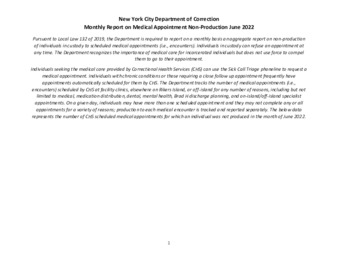 Pursuant to Local Law 132 of 2019, the Department is required to report on a monthly basis an aggregate report on non-production of individuals in custody to scheduled medical appointments. The data within the report represents the non-unique number of incarcerated individuals who were not produced.