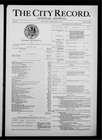 The City Record newspaper publishes notices which includes but is not limited to: public hearings and meetings, public auctions and sales, solicitations and awards and official rules proposed and adopted by city agencies. This is the City Record Newspaper for June 16, 1882.