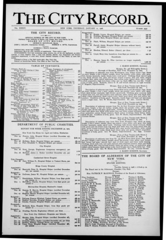 The City Record newspaper publishes notices which includes but is not limited to: public hearings and meetings, public auctions and sales, solicitations and awards and official rules proposed and adopted by city agencies. This is the City Record Newspaper for January 11, 1906.