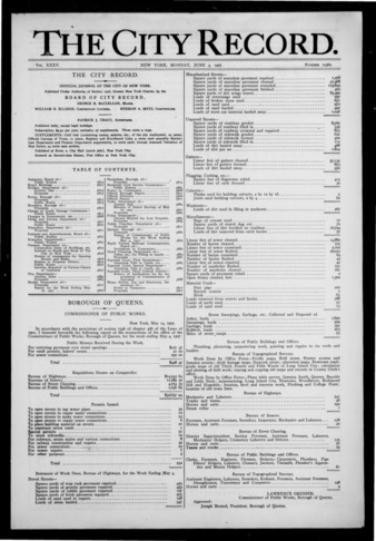 The City Record newspaper publishes notices which includes but is not limited to: public hearings and meetings, public auctions and sales, solicitations and awards and official rules proposed and adopted by city agencies. This is the City Record Newspaper for June 03, 1907.
