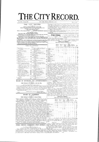 The City Record newspaper publishes notices which includes but is not limited to: public hearings and meetings, public auctions and sales, solicitations and awards and official rules proposed and adopted by city agencies. This is the City Record Newspaper for February 26, 1915.