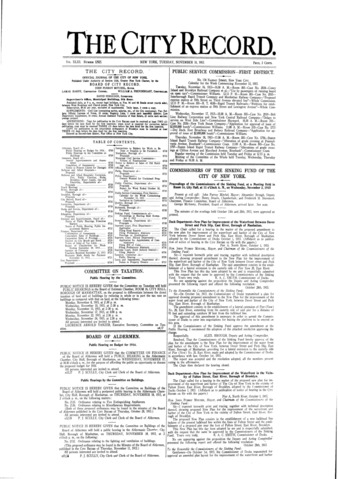 The City Record newspaper publishes notices which includes but is not limited to: public hearings and meetings, public auctions and sales, solicitations and awards and official rules proposed and adopted by city agencies. This is the City Record Newspaper for November 16, 1915.