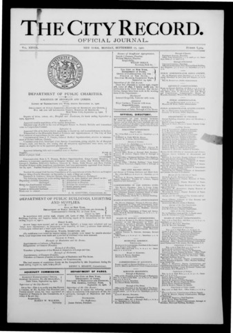 The City Record newspaper publishes notices which includes but is not limited to: public hearings and meetings, public auctions and sales, solicitations and awards and official rules proposed and adopted by city agencies. This is the City Record Newspaper for September 17, 1900.
