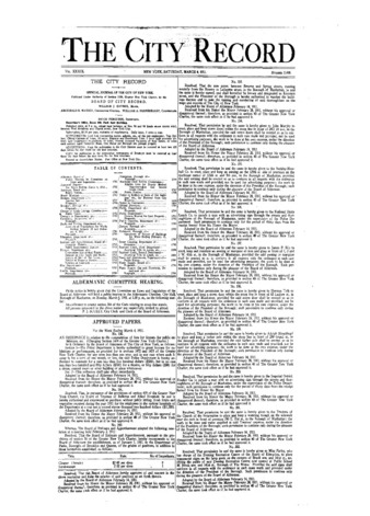 The City Record newspaper publishes notices which includes but is not limited to: public hearings and meetings, public auctions and sales, solicitations and awards and official rules proposed and adopted by city agencies. This is the City Record Newspaper for March 04, 1911.