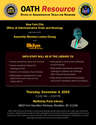 OATH staff were at the library to assist and educate people about what to do should they have received a summons and to check to determine if someone has an outstanding summons. Materials about remote hearings and other free resources were provided to the public as well.