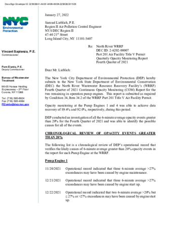 North River Wastewater Resource Recovery Facility, quarterly opacity continuous monitoring report for fourth quarter of 2021