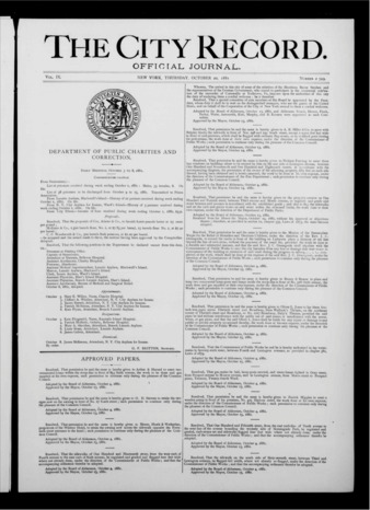 The City Record newspaper publishes notices which includes but is not limited to: public hearings and meetings, public auctions and sales, solicitations and awards and official rules proposed and adopted by city agencies. This is the City Record Newspaper for October 20, 1881.