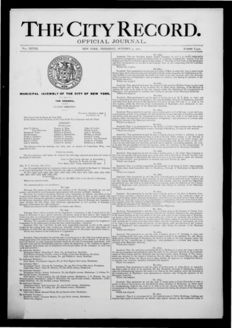 The City Record newspaper publishes notices which includes but is not limited to: public hearings and meetings, public auctions and sales, solicitations and awards and official rules proposed and adopted by city agencies. This is the City Record Newspaper for October 04, 1900.