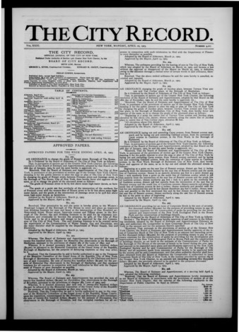 The City Record newspaper publishes notices which includes but is not limited to: public hearings and meetings, public auctions and sales, solicitations and awards and official rules proposed and adopted by city agencies. This is the City Record Newspaper for April 20, 1903.