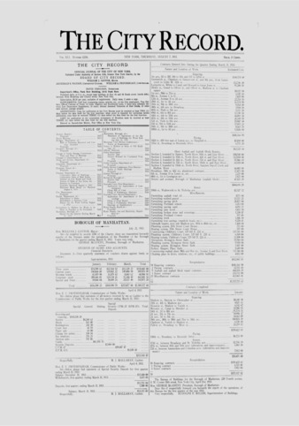 The City Record newspaper publishes notices which includes but is not limited to: public hearings and meetings, public auctions and sales, solicitations and awards and official rules proposed and adopted by city agencies. This is the City Record Newspaper for August 07, 1913.