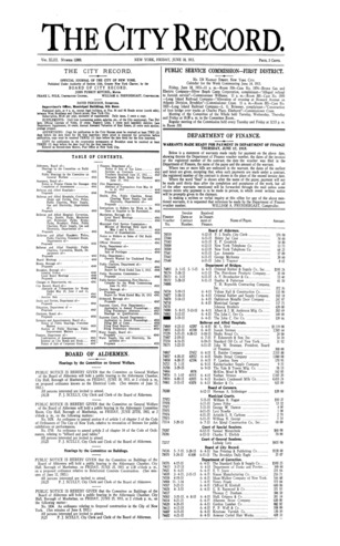 The City Record newspaper publishes notices which includes but is not limited to: public hearings and meetings, public auctions and sales, solicitations and awards and official rules proposed and adopted by city agencies. This is the City Record Newspaper for June 18, 1915.
