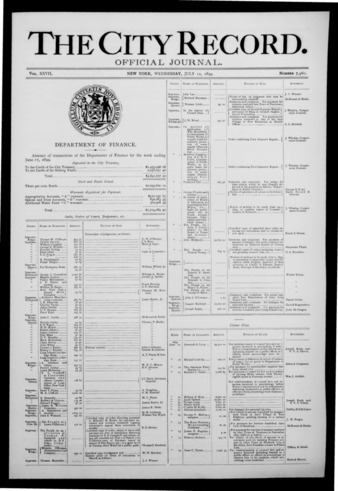 The City Record newspaper publishes notices which includes but is not limited to: public hearings and meetings, public auctions and sales, solicitations and awards and official rules proposed and adopted by city agencies. This is the City Record Newspaper for July 12, 1899.