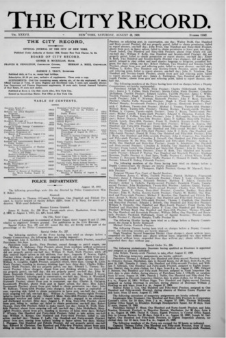 The City Record newspaper publishes notices which includes but is not limited to: public hearings and meetings, public auctions and sales, solicitations and awards and official rules proposed and adopted by city agencies. This is the City Record Newspaper for August 28, 1909.