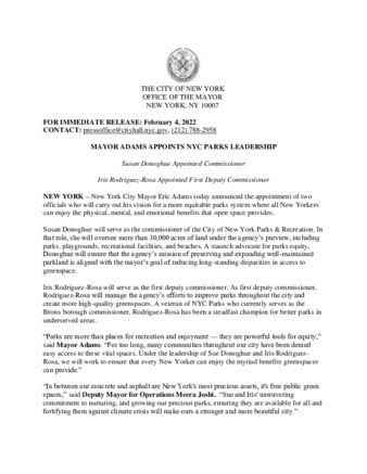 New York City Mayor Eric Adams announces the appointment of two officials, including Susan Donoghue as Commissioner of City of New York Parks & Recreation. and Iris Rodriguez-Rosa as First Deputy Commissioner.