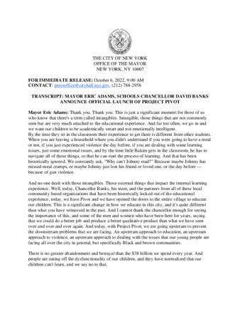 TRANSCRIPT: MAYOR ERIC ADAMS, SCHOOLS CHANCELLOR DAVID BANKS ANNOUNCE OFFICIAL LAUNCH OF PROJECT PIVOT