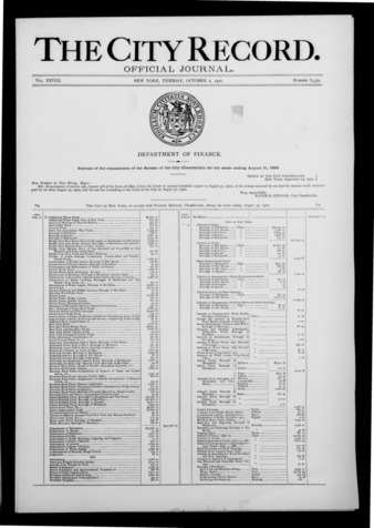 The City Record newspaper publishes notices which includes but is not limited to: public hearings and meetings, public auctions and sales, solicitations and awards and official rules proposed and adopted by city agencies. This is the City Record Newspaper for October 02, 1900.