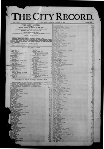 The City Record newspaper publishes notices which includes but is not limited to: public hearings and meetings, public auctions and sales, solicitations and awards and official rules proposed and adopted by city agencies. This is the City Record Newspaper for January 03, 1905.