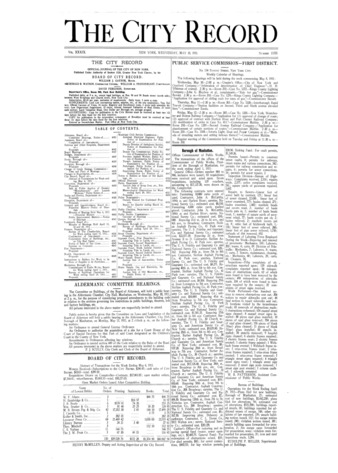The City Record newspaper publishes notices which includes but is not limited to: public hearings and meetings, public auctions and sales, solicitations and awards and official rules proposed and adopted by city agencies. This is the City Record Newspaper for May 10, 1911.