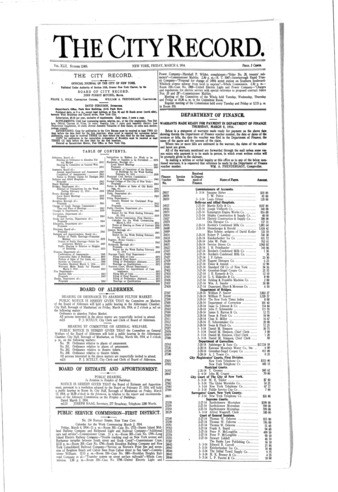 The City Record newspaper publishes notices which includes but is not limited to: public hearings and meetings, public auctions and sales, solicitations and awards and official rules proposed and adopted by city agencies. This is the City Record Newspaper for March 06, 1914.